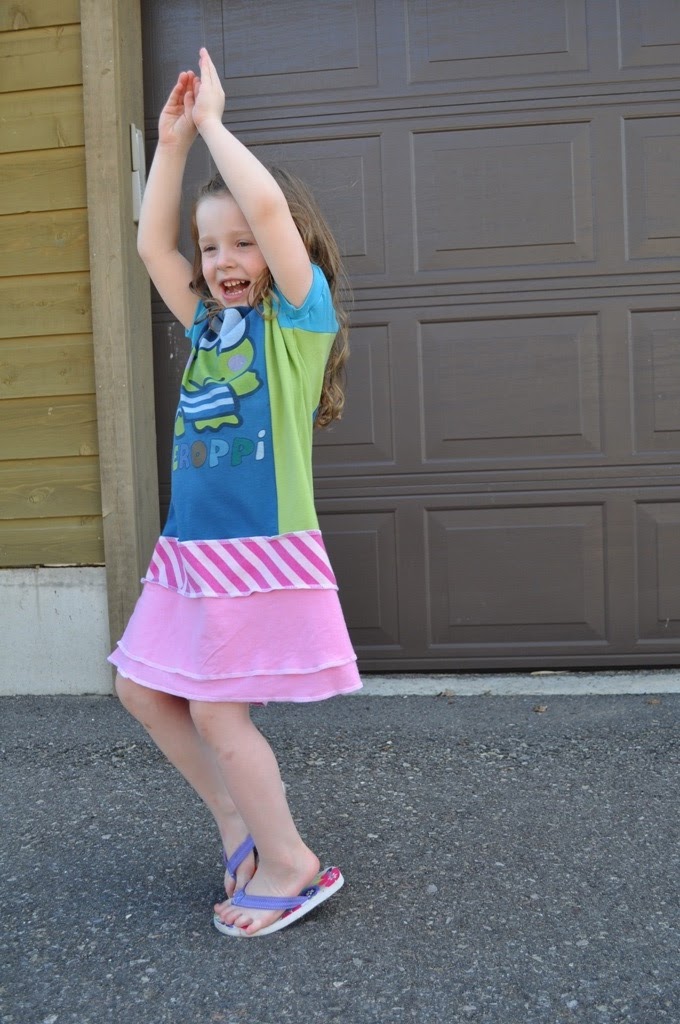 It was originally a tank I chopped off below the bust, I serged the top of what became the skirt and added the ties from the tank as a waistband. There is a zipper in the side that I'm pretty darn proud of... I don't do a lot of zippers but somehow it just worked this time. Yeah! The fabric has a little metallic gold to it in places, which is Bug's favorite part but it didn't photograph well.
